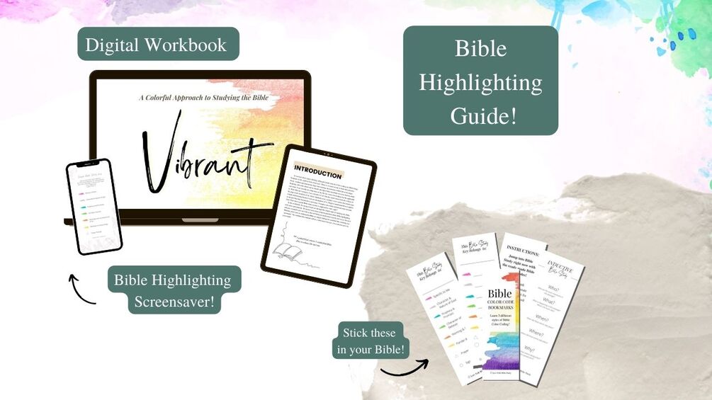 2 PDF containing the Vibrant Bible Study workbook, 3 printable study keys, 2 Bible study/notes templates, and a hyperlink to the Bible Highlighting Screensaver